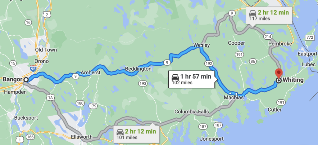 Access points to the Orange River Water Trail are on U.S. Route 1 about 13-16 miles east of Machias, Maine or about 3-5 miles west of Whiting, Maine.